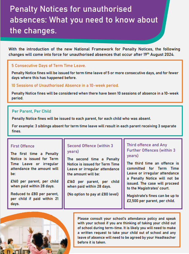 If your child(ren)’s attendance falls below 95%, please be aware that the case will be referred to our Education Welfare Officer.